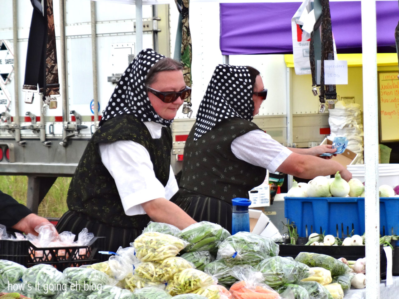 After admiring the vintage tractors as much as one can muster, we headed toward the farmer’s market.  Anyone that knows me well, knows that I am obsessed with Hutterites.  Similar to the Amish + Mennonites, there is a whole lot of them here in Alberta!  I love me a good polka dot scarf + oversized sunglasses!Blog - 03