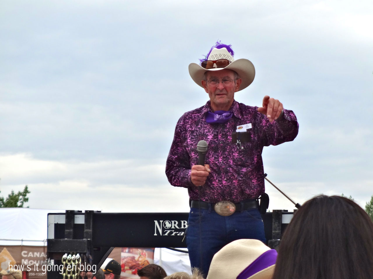 Jeff + Langdon were taking waaaaay too long in the barn.  I was getting hella bored + couldn’t look at one more plate of chocolate chip cookies or one more sprig of invasive weed.  Outside, there was a pie auction going on.  The MC was this gorgeous gent in a purple shirt + purple ostrich feather in his cowboy hat.Blog - 14