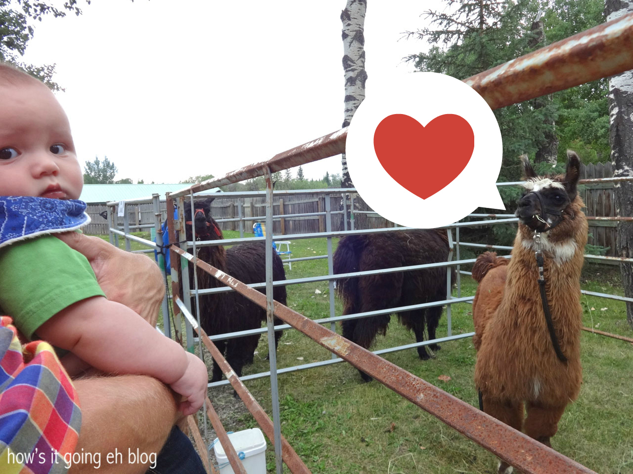 Langdon had his first encounter with some llamas + alpacas.  This llama was completely enamored with Langdon.  She would not stop longingly gazing at him with her soupy, doe eyes!  Langdon was very unsure about these shaggy pack animals.Blog - 15