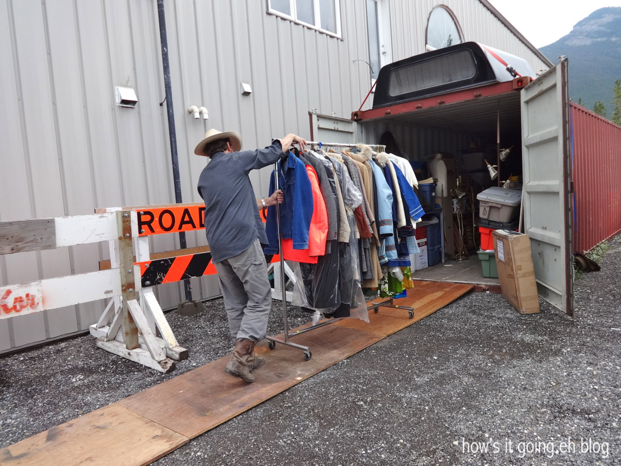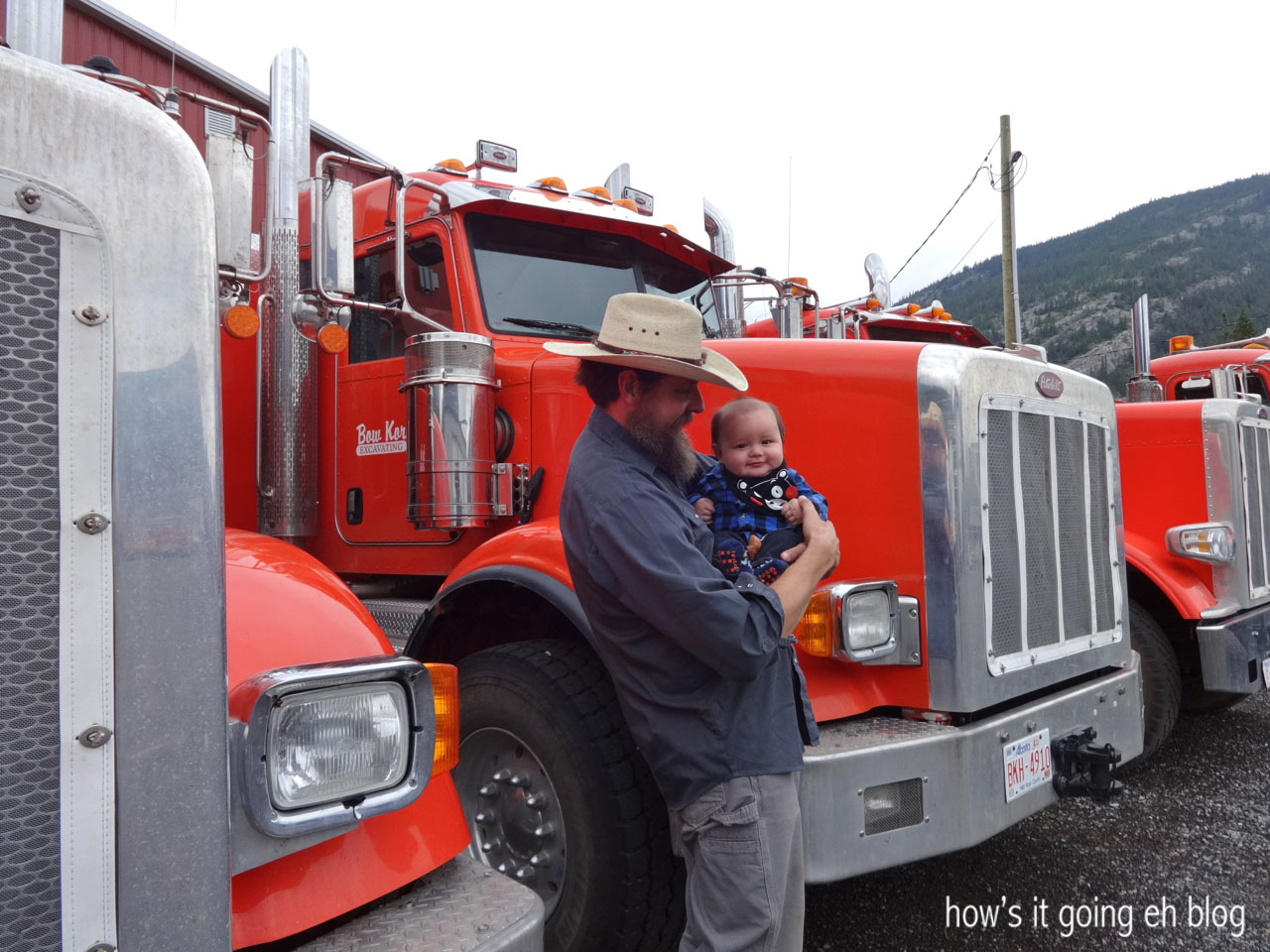 The next day we headed to Canmore – but first a stop at our shipping container of horrors.  If you are new to this blog, Jeff has a 40 foot shipping container filled to the brim with stuff that he’s accumulated for 20 years when he lived in Alberta.  I can’t even go on.  It is housed in the yard of a trucking company.  Langdon is already loving boy things like big ol’ honkin’ trucks!!!  BOY STYLE!!!!blog - 02