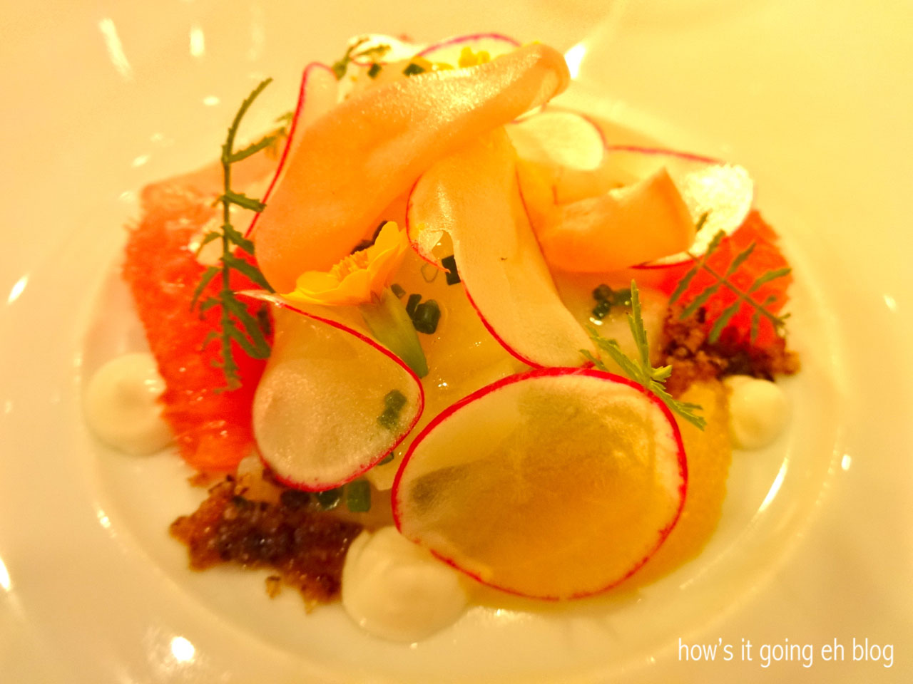 Scallop, citrus, creme fraiche, burnt onion + marigold!!  The scallops were velvety-melt-in-your-mouth!!!Langdon Hall - 17