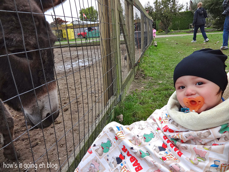 This little mule was sweet + tiny + he was enamored with Langdon. Another smile! Win!!! Do you like Langdon’s beanie? Sorry – if you’re a Canuck I meant to say, do you like Langdon’s toque? I made it out of this slippery bamboo fabric + it fits him like a do rag!!! Biggie Smalls!