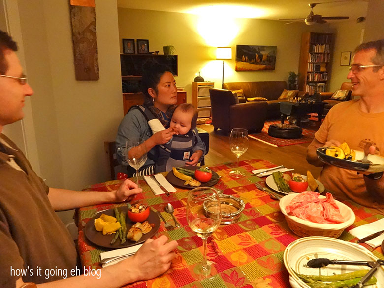 That night we went to my brother-in-law + sis-in-law’s for Canadian Thanksgiving dinner! They always host a great feast! Did you know Canadian Thanksgiving is in October?! Weird, right?!?! I’ll NEVER get used to it! NEVER I TELL YOU!!!!! I don’t recall, but according to this photographic evidence, Tom is telling me a funny story to which cousin Neil also enjoys…but I appear shocked/scared/aghast. Why? I wish I could remember! Haha! Langdon is busy looking at my plate thinking, “Num num nummy…me want big people foooood!”!