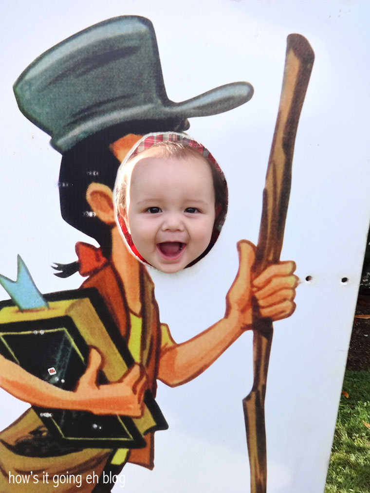 Another touch + go day for Mr. Fussy Pants. But here is a brief moment of enjoyment posing in yet another cutout – Johnny Appleseed!