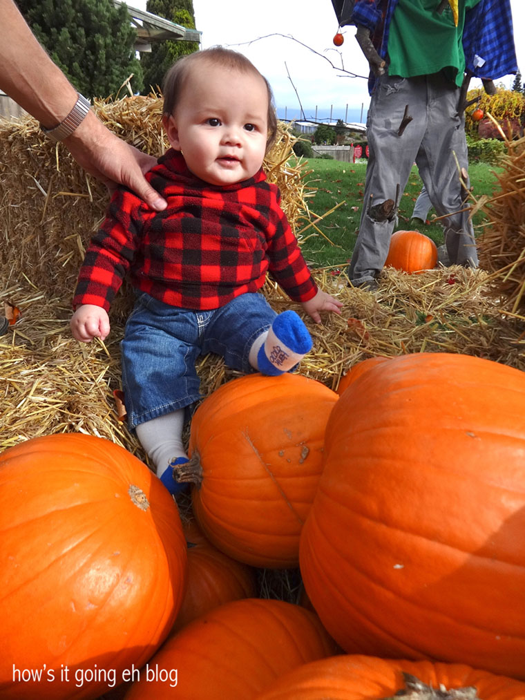 I had this romantic image in my head that we were going to take tons of pictures, plop Langdon down in the dirt surrounded by big, fat, rotund pumpkins + we were all going to laugh + sing + dance. But nay…Lang Lang was in a crap crappy mood, it was freaking cold + he was having none of it. I somehow managed to get a smile!