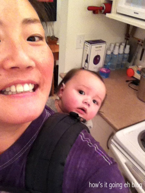 I carry my buddy on my back when he gets fussy, as I work around the house! Do you like the box of wine next to Langdon’s bottles?! Mommy needs a drink!!!