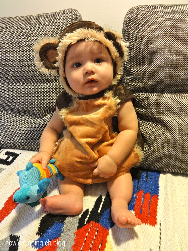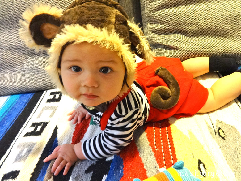 Well, today is Halloween!!! I got this monkey costume for the little primate. I found it cute but boring!