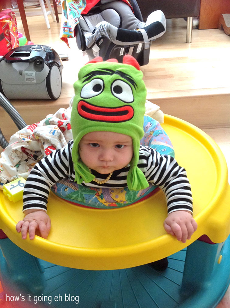 Damn that Halloween party. DAAAAAAAMN THAT HALLOWEEN PARTYYYYYY!!!!! Langdon became sick after the mommy-baby Halloween party that Langdon I went to. Missed our Halloween? Click here! So many drooly babies sharing toys + slapping each other with their moist, wet, meaty hands!!!! GERM FEST! Here’s Langdon after the party, still wearing his monkey hat looking very self satisfied that he had won a prize for his costume at the party. Chubby cheeks was torturing his stuffed monkey contentedly.