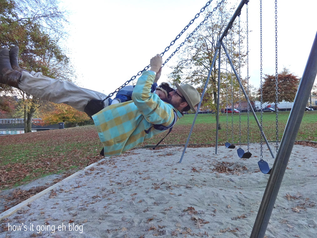 The next day we went to the New Brighton Park. The cold still hadn’t reared it’s ugly head yet. It was a bitingly chilly day, which I’m sure didn’t help the situation. Dad + baby swinging merrily.