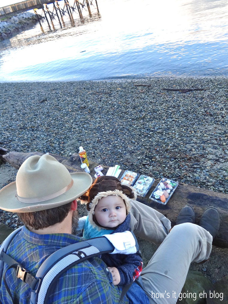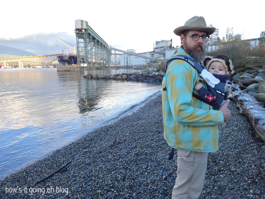 On the beach with a view of Seconds Narrow Bridge, one of the bridges that leads to North Vancouver. Baby is looking Grumpy Pants.