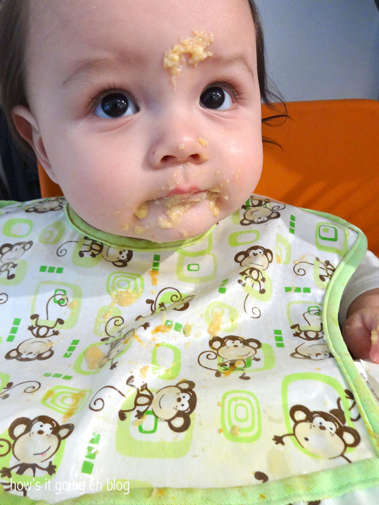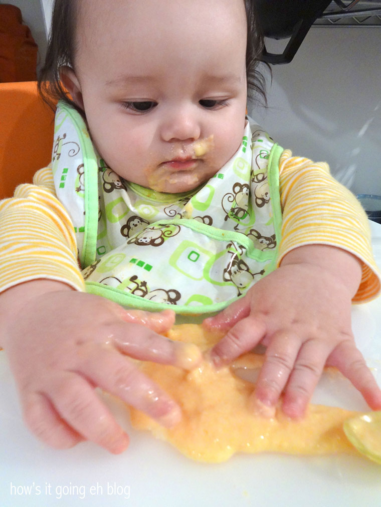 With lack of sleep + general crankiness everything has been a fight + struggle. Don’t get me started on diaper changes. You don’t want to know. He has been screeching + grabbing at his food bowl, so I gave up + let him have at it. Poured that sucker all over the table. “Screw it” I said.