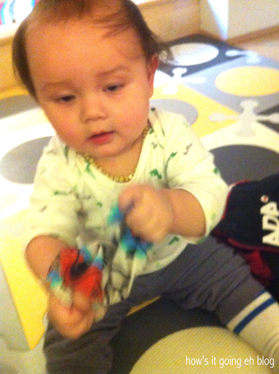 Oh thank god back at home on his new play mat by Skip Hop!!! No bright, ugly plat mats for us! I couldn’t bear to stare at something I didn’t like all day.