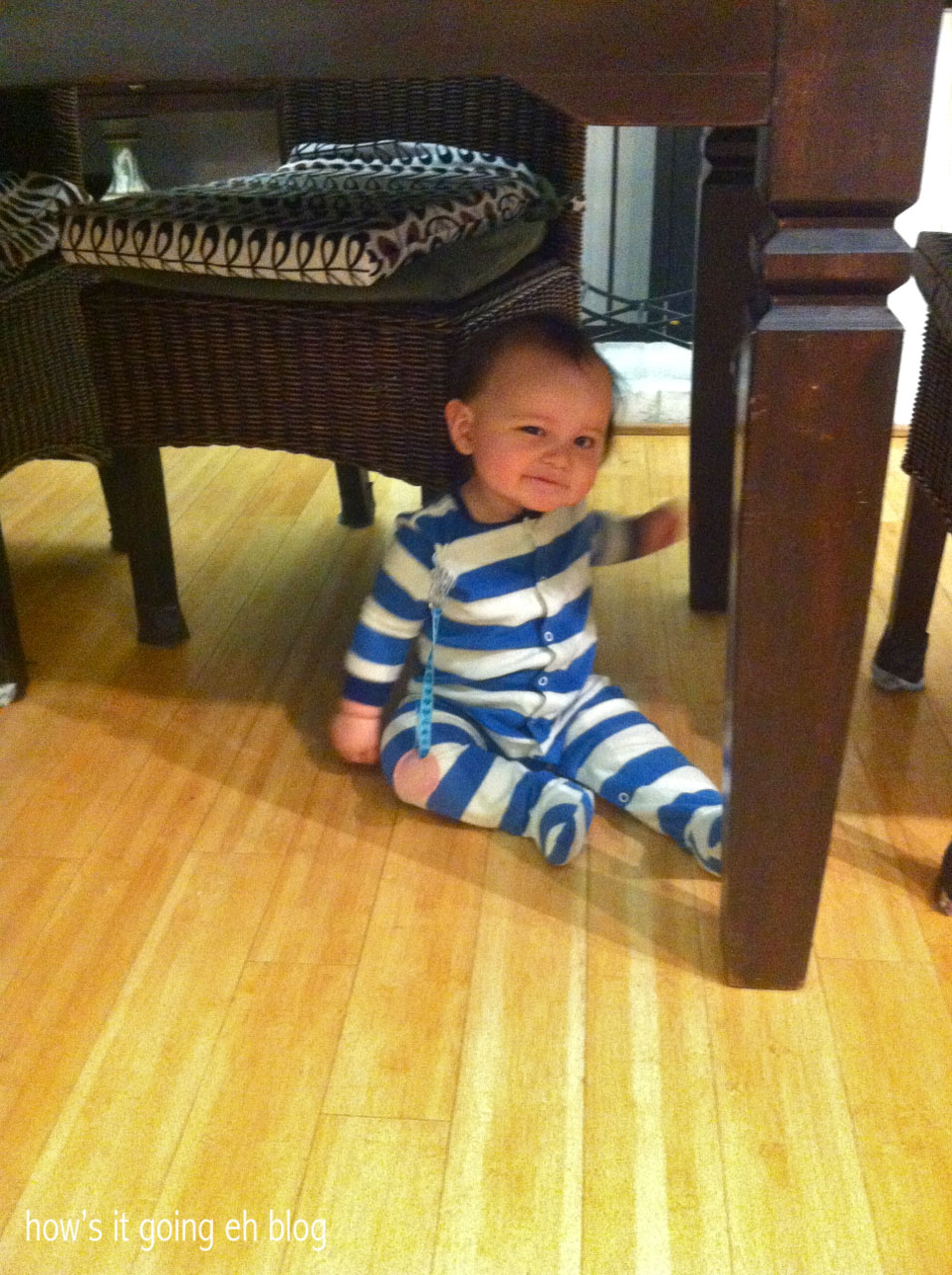 We don’t put him in the walker for too long a period of time. So his crawling is getting super fast + we shadow him constantly. Check out that sassy little smirk as he “hides” under the dinner table.