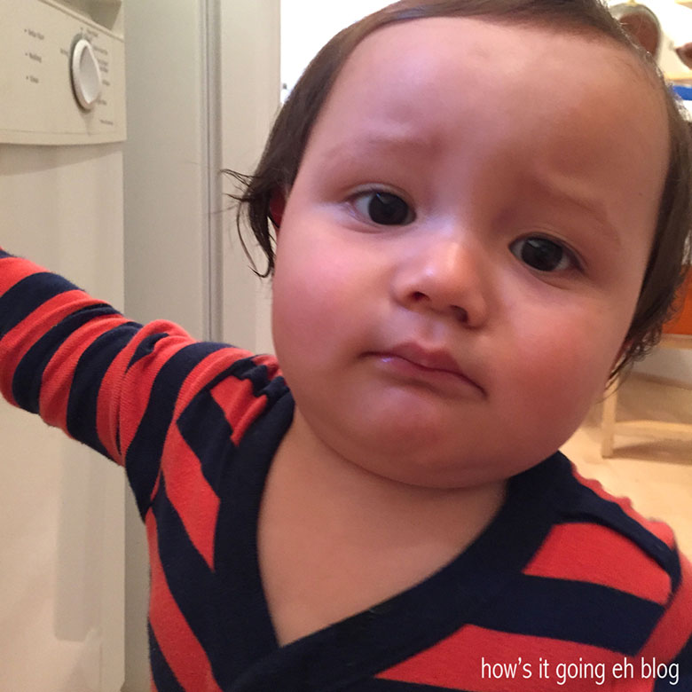 Especially when I’m prepping + cooking dinner – safely.  Then the whining + crying + tugging instantly stops.  Content, quiet baby.  Feeling safe + secure.  Poor thing’s brain is exploding from learning so many new things + new skills that he still needs the close physical comfort of familiar ol’ mom.  There you have it.  Hope everyone’s having a great weekend!