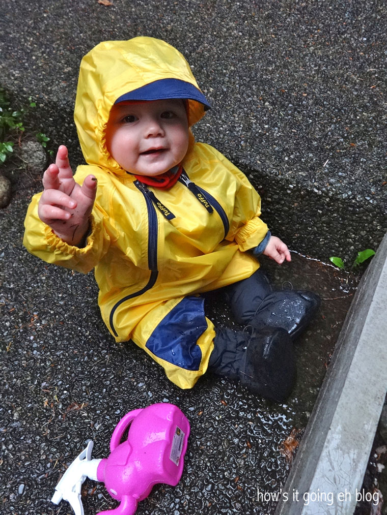 I was like “How do Canuck babies let off steam???”.  Put on a rain suit + get out there, kimosabe.  But let me tell you, getting a baby into a rain suit is no easy feat.  It’s like wrestlin’ a three piece suit onto a greased pig.
