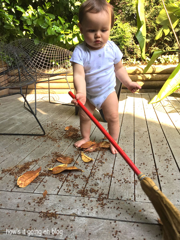 Jeff + I found Langdon an old corn husk broom at a vintage show.  I think the ladies thought we were going to put it in a glass case + look at it.  They were kind of horrified when they saw Langdon sweeping.  Hah!  We go outside, I sweep a little pile for him to swish around.BLOG - 07