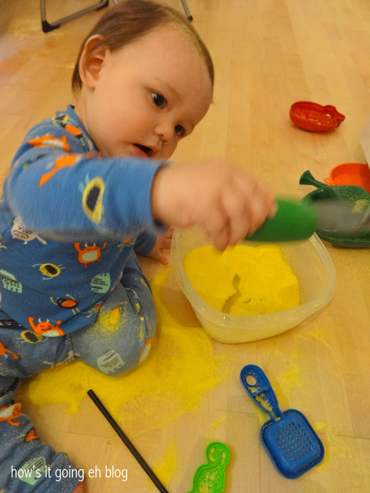 Speaking of scooping, one morning he was having a fit in the kitchen so I panicked + poured corn meal in a container + gave him tools.  Well, let’s just say it occupied him long enough for me to organize the kitchen cabinets, but there was a real corn-y cleanup left behind!  It was all so worth it.BLOG - 10
