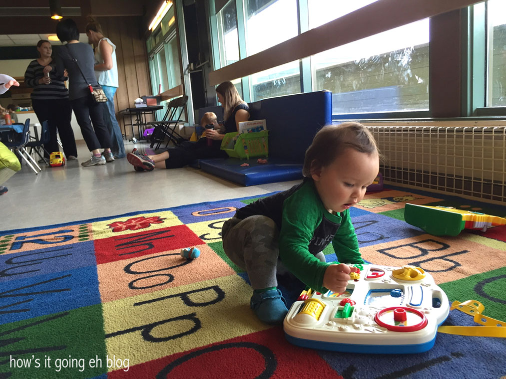 In Canada the community centers are wonderful resources for moms with babies + toddlers.  Like, so impressive.  On Mondays we go to a family resource drop in for $2.  There’s books, toys galore, a snack table, arts + crafts, circle time, + let’s not forget really strong coffee fuel for all the weary, strung out looking moms who clutch onto their coffee mugs as if their lives depended on it.BLOG - 14