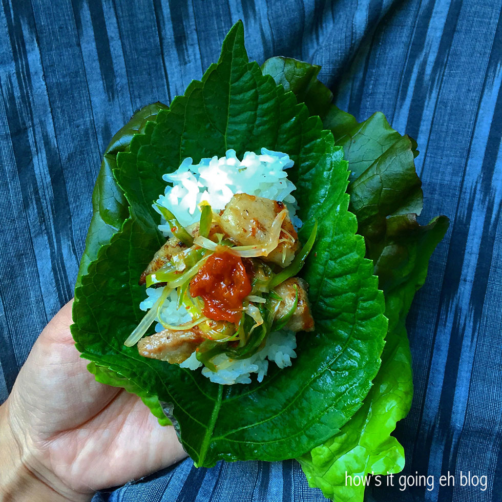 Red leaf lettuce, shiso (or sesame) leaf, rice, bbq meat, green onion salad + gochujang paste!!!