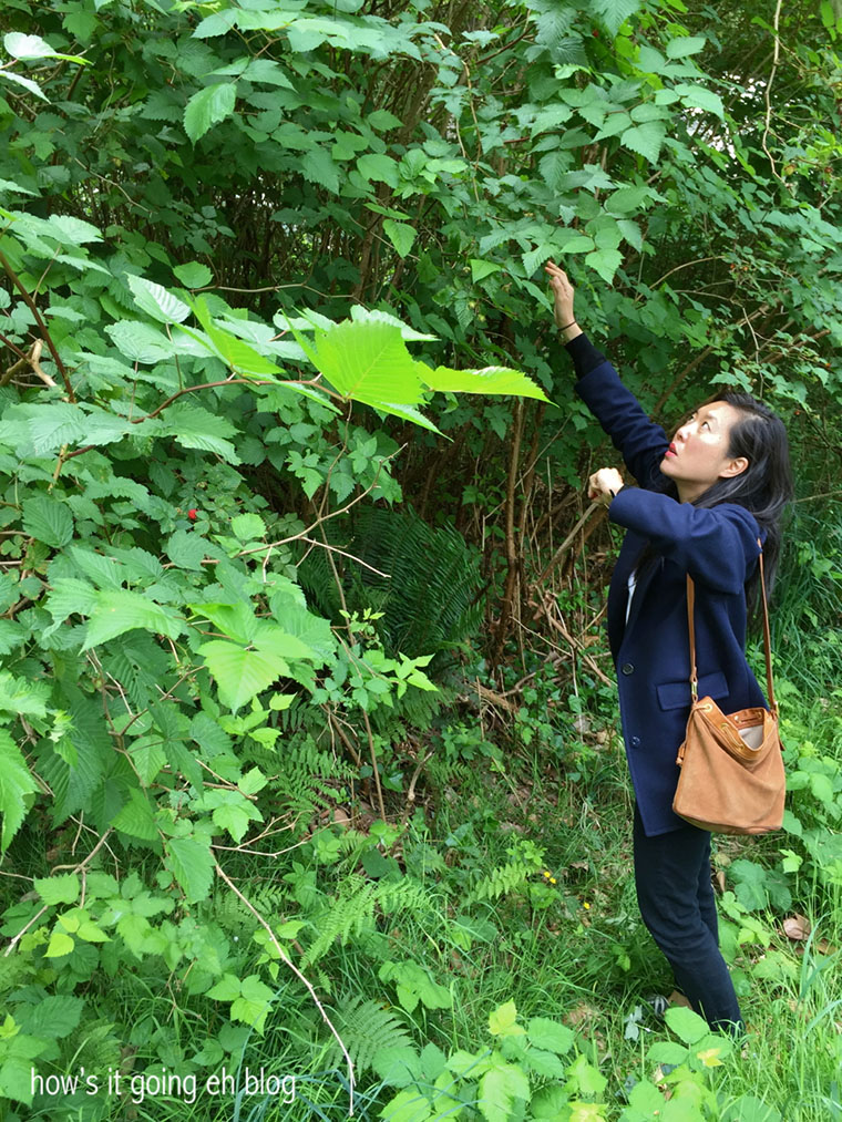 Salmon Berry picking season starts in late May. I spotted some + commanded my much taller friend to git in there + reach for some berries!
