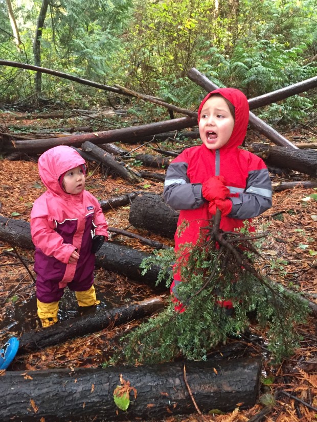 So I’ll make this quick.  They say it was one of the rainiest Novembers on record but it didn’t truly feel that way.  We’ve been trying to spend a lot of days out doors.  Our Strong Start (a BC program that helps parents participate in a preschool like environment that readies a child for kindergarten) has a forest program once a week.  Rain or shine.  It’s kind of psychotic taking an early walker + sensitive toddler into the muddy, wet, cold forest.  Dressing them in multiple layers.  One falls.  The other cries.  Both want to be picked up etc.  In this picture Lang fell over a log.  I tried to pick him up to cuddle him but he refused + wanted to cry it out.  Fair enough.  Go for it, buddy.