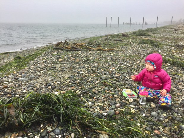 Snack time.  We were the only ones on the beach.  The fog was dense.  And it was freezing.