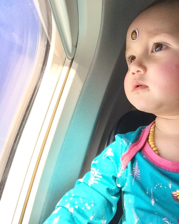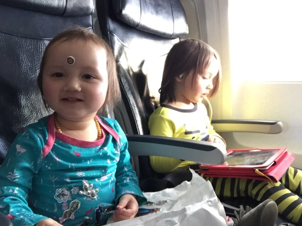 I was nervous about the flight to LA because now that Clementine is walking she wants to always be on the move.  I thought I was going to be one of those moms walking the baby up + down the aisle.  Up + down.  Uuuuuup + doooown.  But the dollar store stickers kept her occupied for a good amount of time!