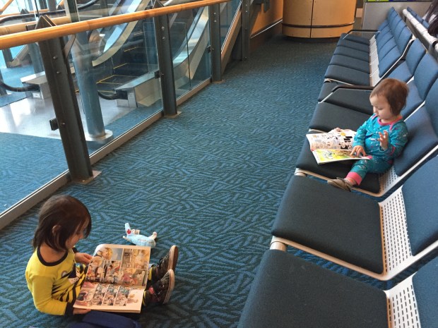 Fast forward to happier times.  The flight to LA went really well!  The kids read comic books while waiting to board.