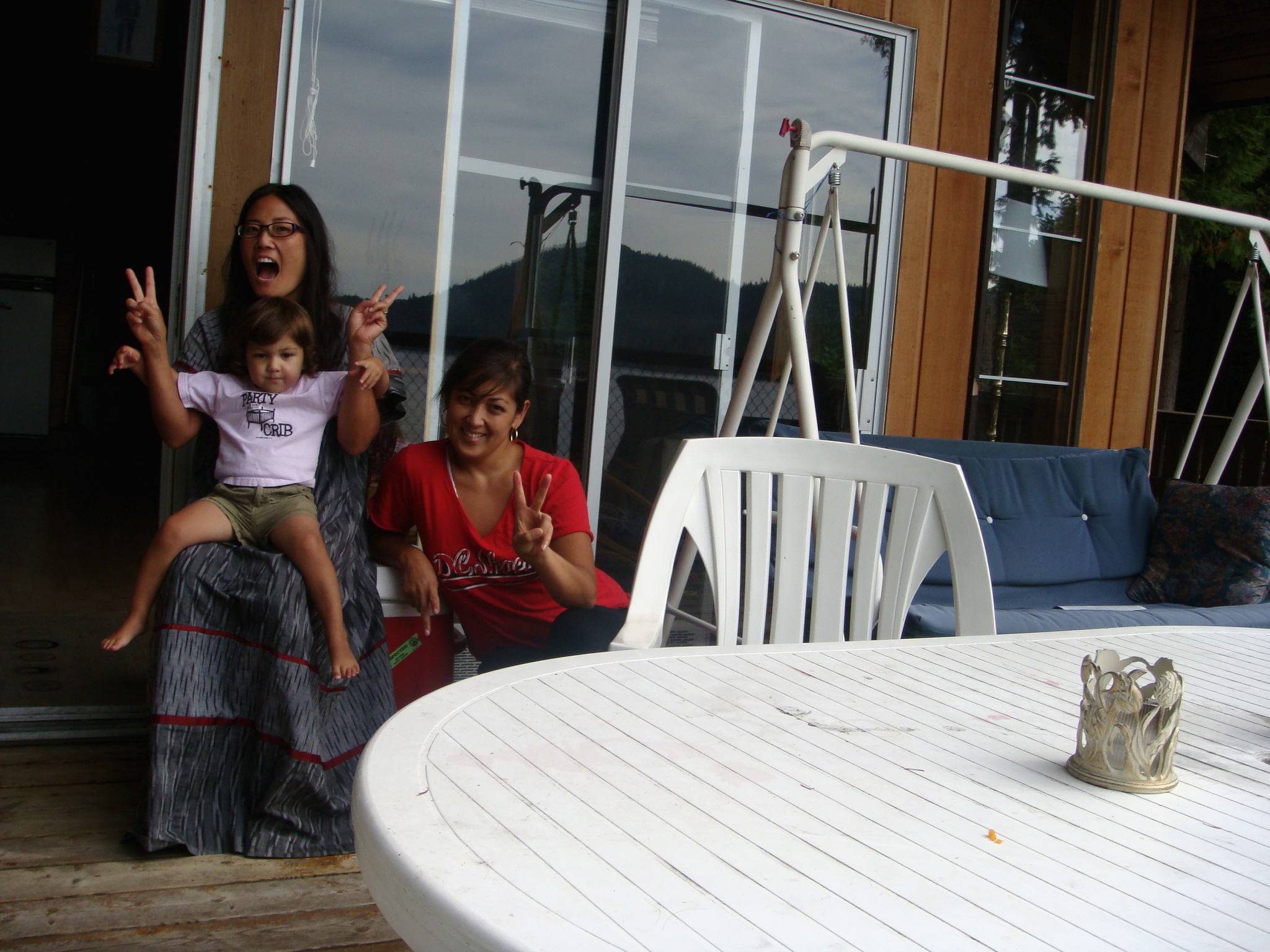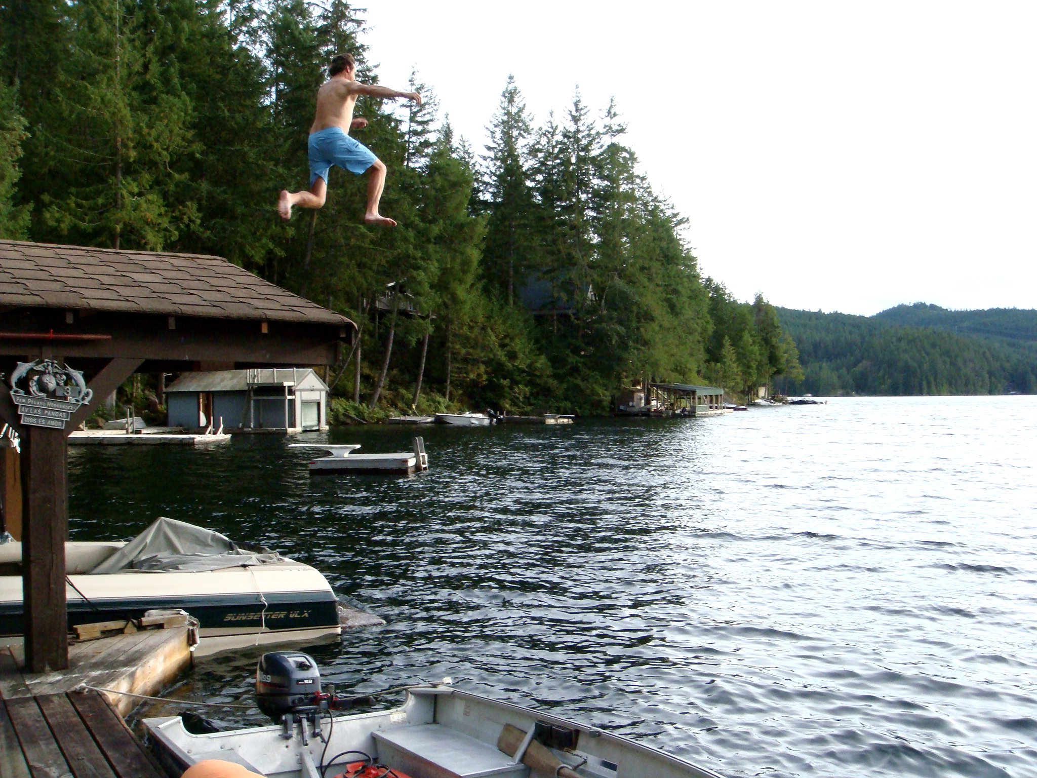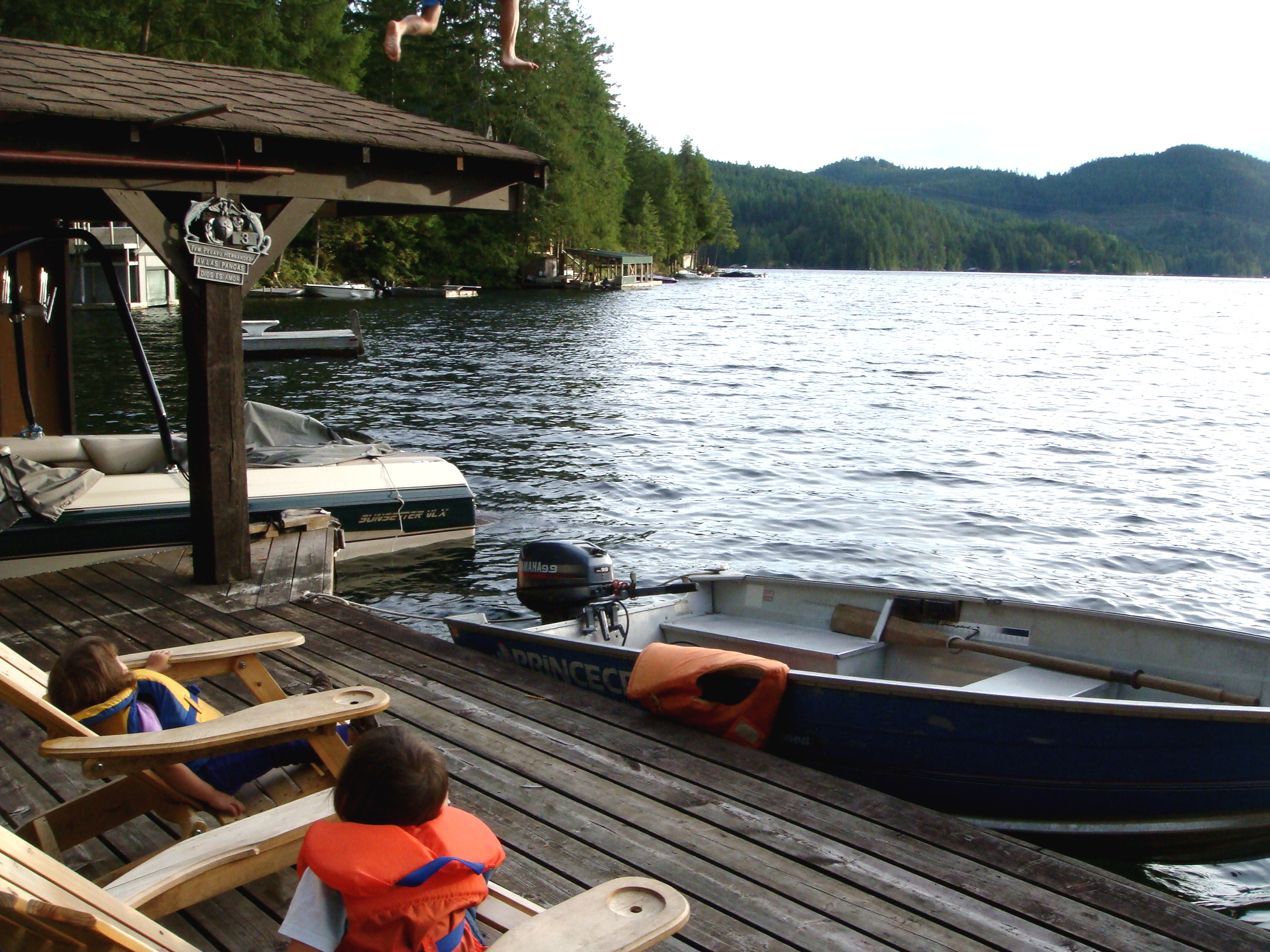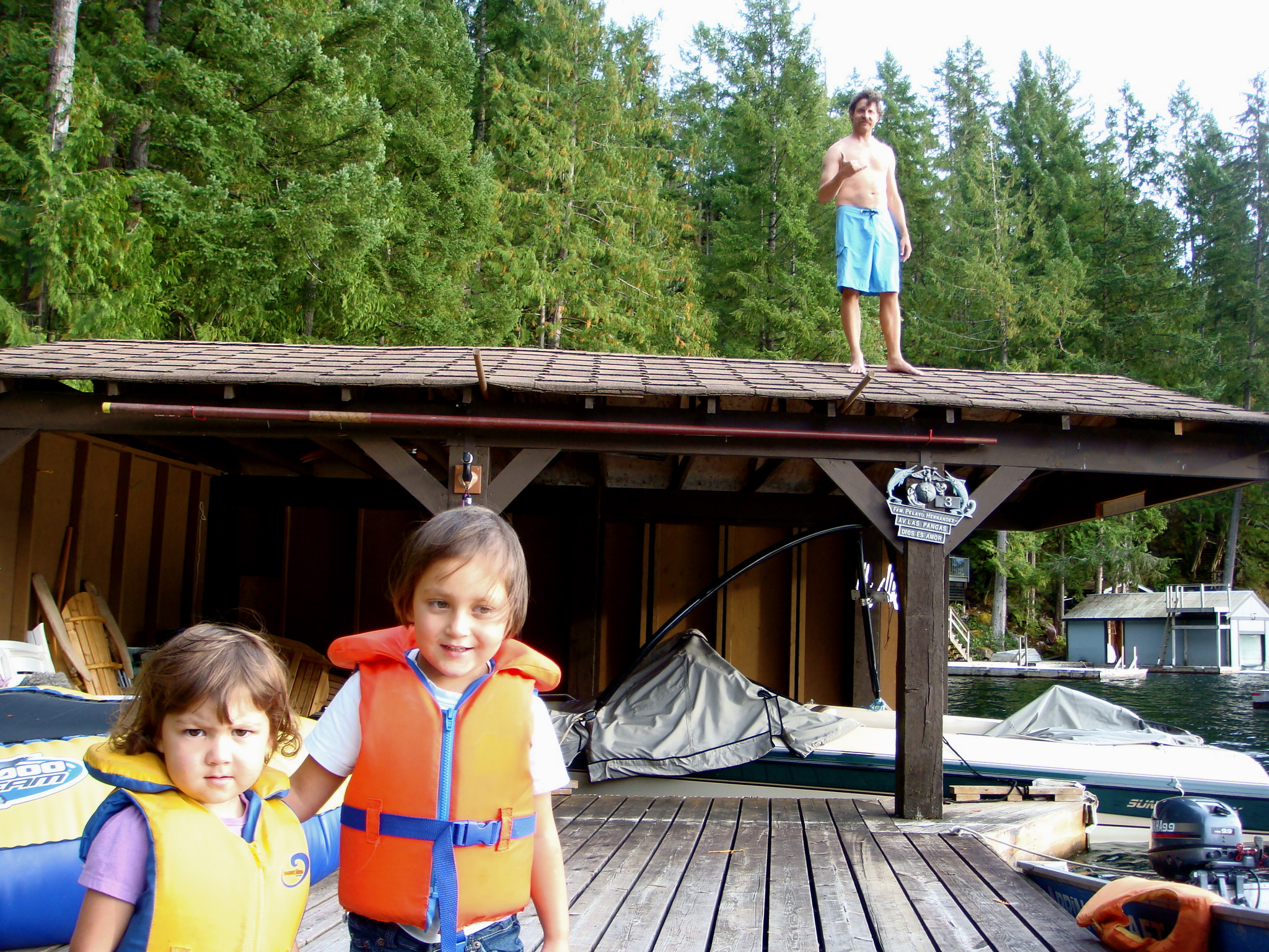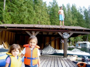 The next day was also warmer than we thought it would be so Jeff decided to get the party started by jumping off the boat house roof as he is want to do. The girls always have to have their life vests on when they are near the water. Auntie Shelli is learning alot of child safety the past couple of months.